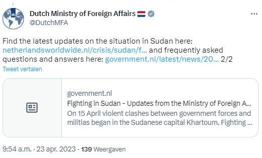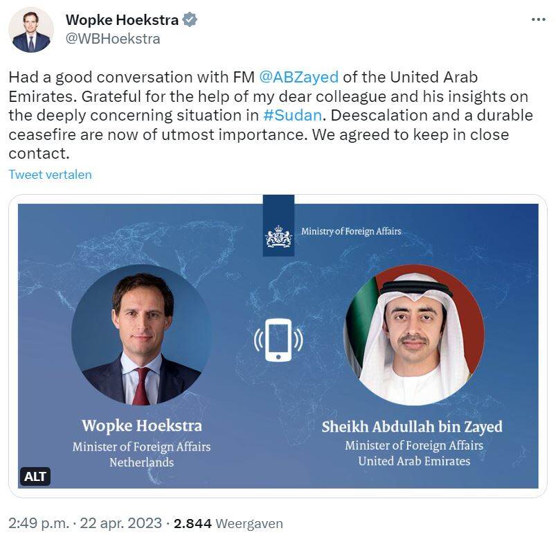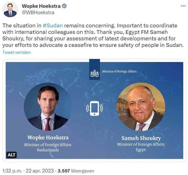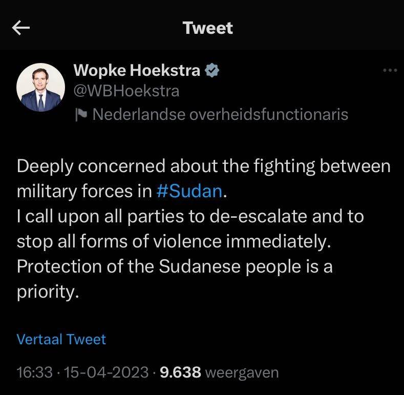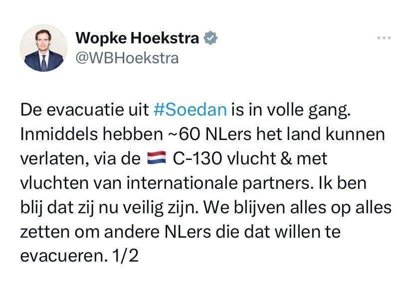 Minister of Foreign Affairs Wopke Hoekstra on the situation in Sudan and his contacts with the embassy team (tweets translated from Dutch).