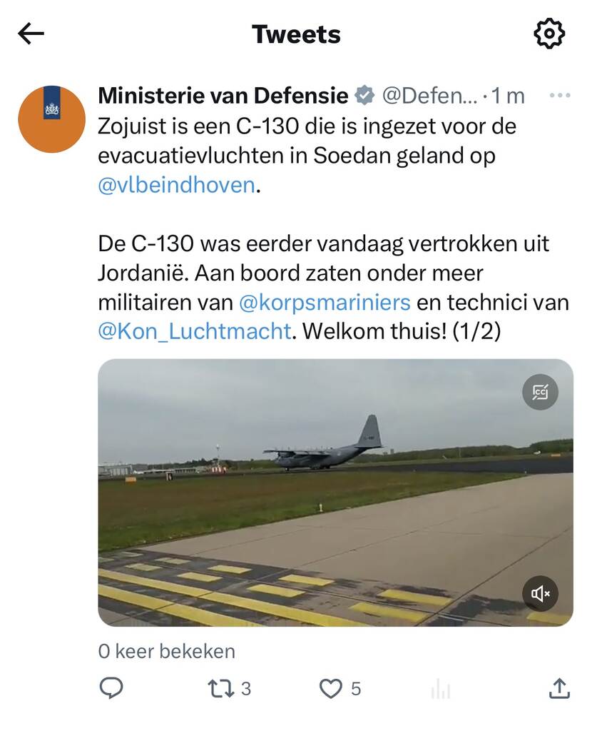 For the third day in a row a Dutch evacuation flight has departed from Sudan. The military aircraft will fly to Jordan, where it will be met in Aqaba by staff from the Ministry of Defence and the Ministry of Foreign Affairs. We are working together to arrange more of these flights today. Later on, the Ministry of Foreign Affairs will issue an update of the number of people who have been evacuated.