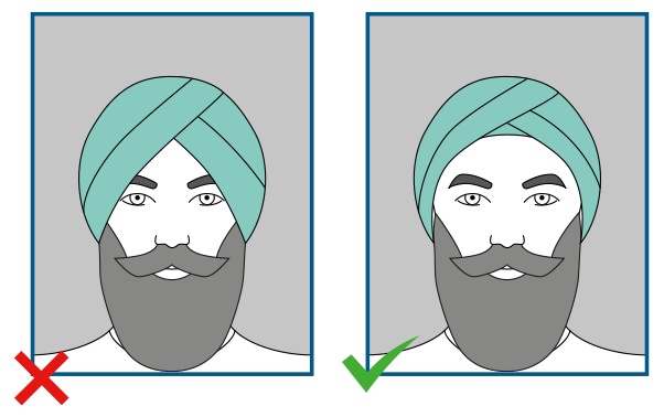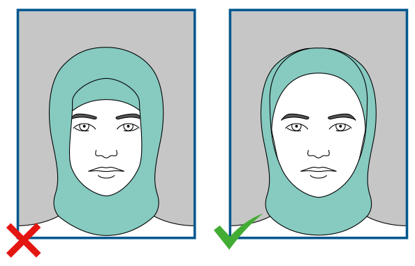 If you keep your head covered because of your religion or belief, then you may keep your head covering on for your photo. The head covering must be plain, in one colour only, and must also contrast with the background.