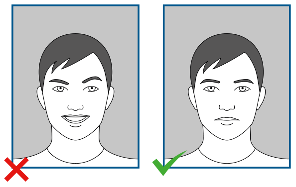 - Expression: ‘neutral expression’, ‘looking straight at the camera’ and ‘mouth closed’;